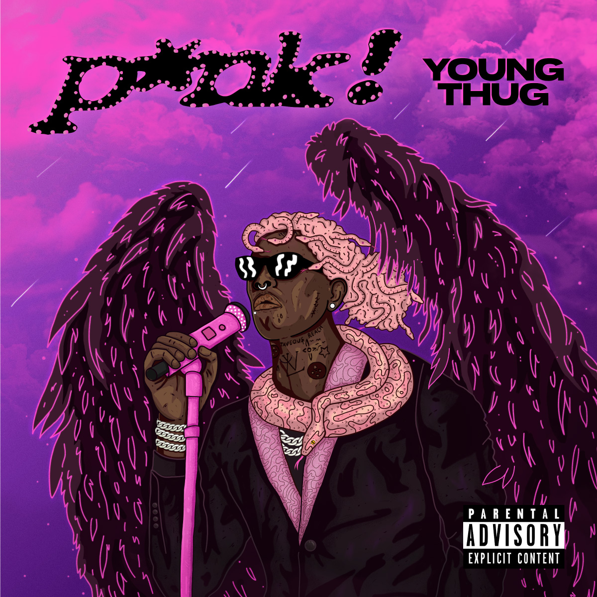My album artwork was heavily influenced by Young Thug’s performance at Lollapalooza. The artist has snakes in his recording studio and treats them like family, therefore surreal snake imagery is a significant theme. The setting is chaotic and apocalyptic, reflecting the hardships and distractions addressed in certain songs, yet the artist remains calm and focused on putting his show.