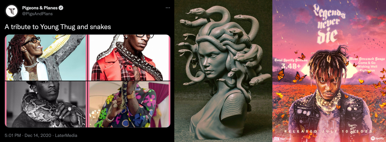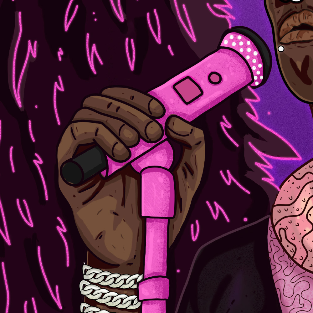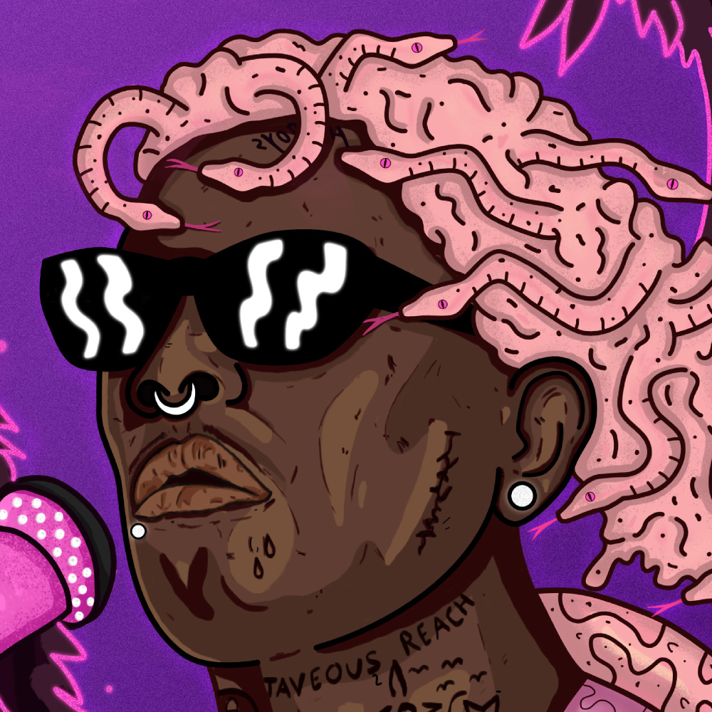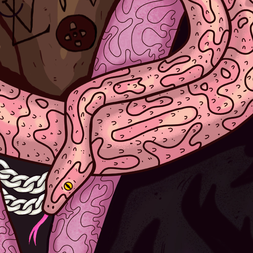My album artwork was heavily influenced by Young Thug’s performance at Lollapalooza. The artist has snakes in his recording studio and treats them like family, therefore surreal snake imagery is a significant theme. The setting is chaotic and apocalyptic, reflecting the hardships and distractions addressed in certain songs, yet the artist remains calm and focused on putting his show.